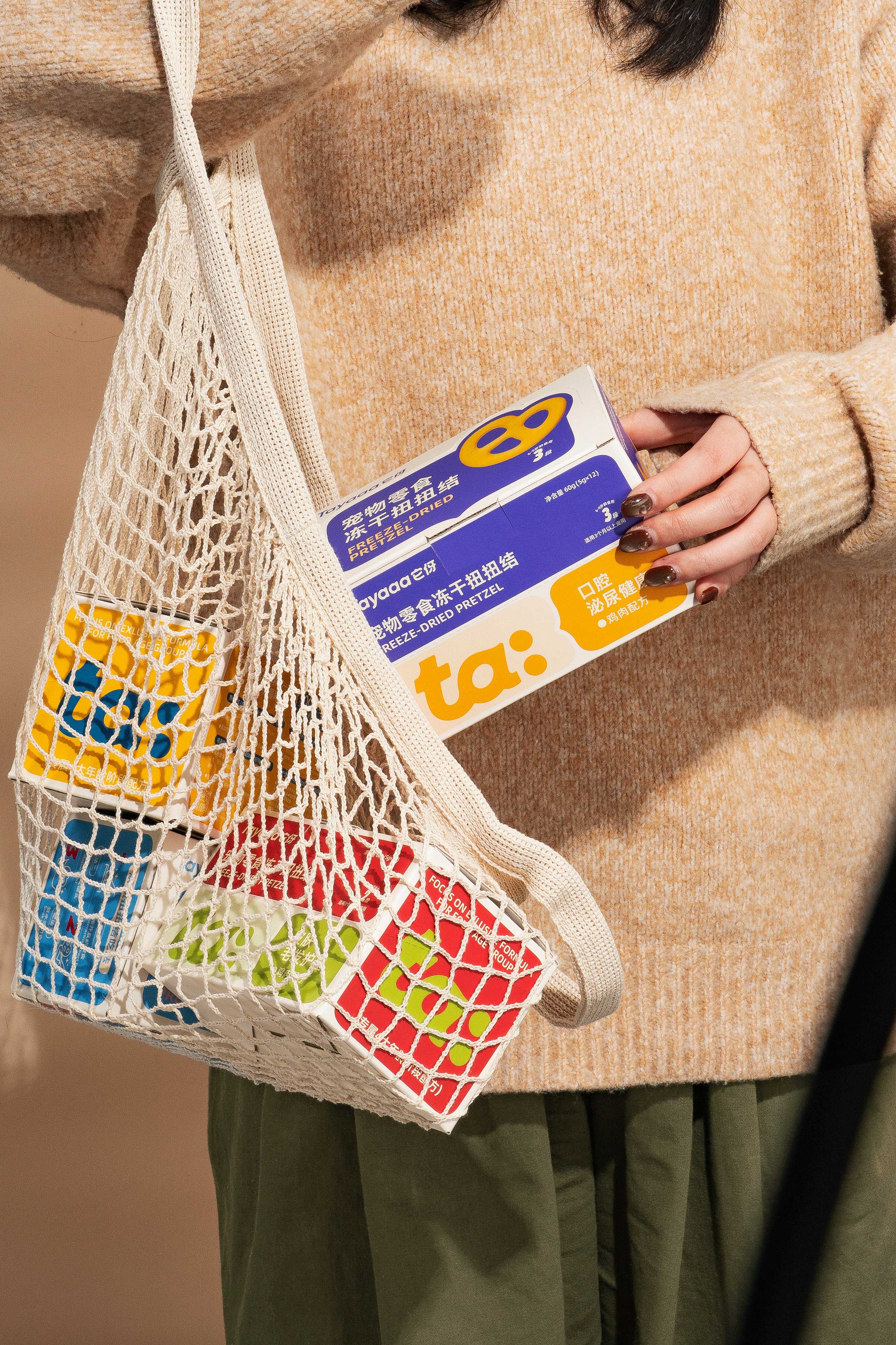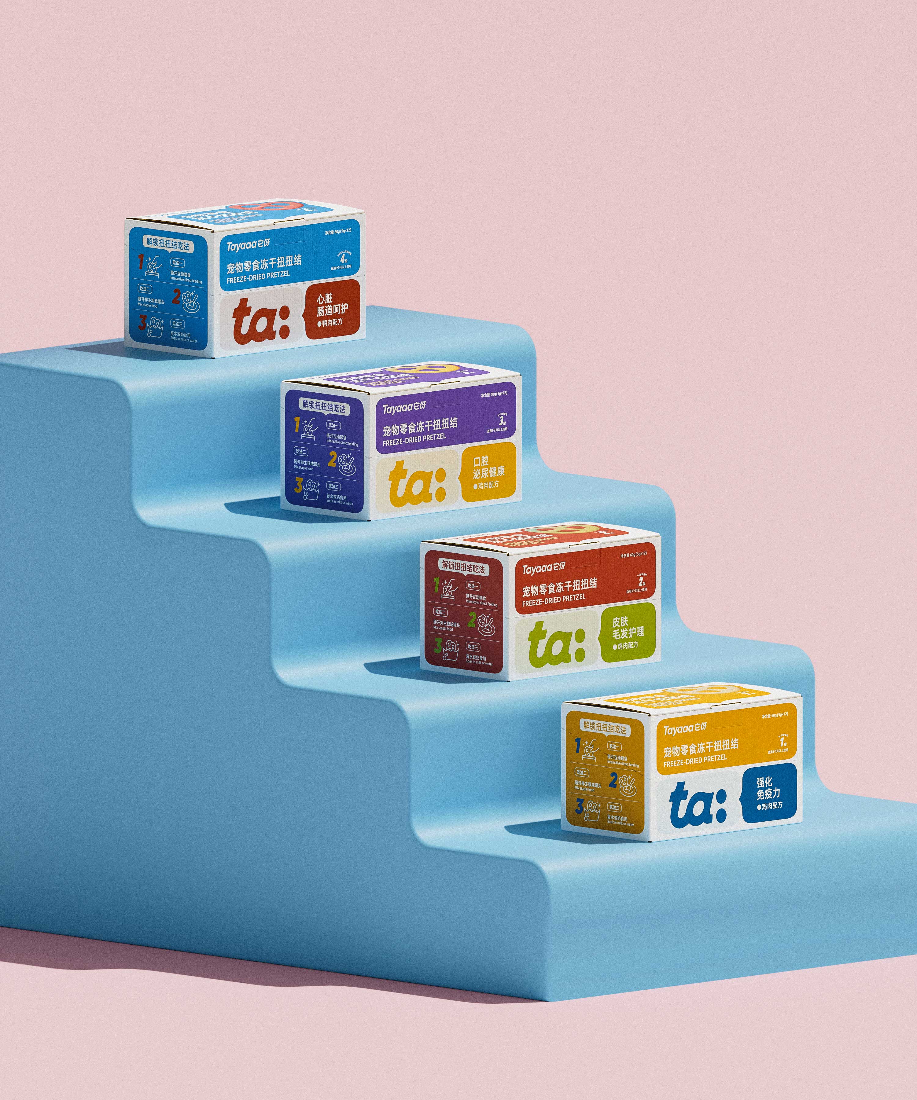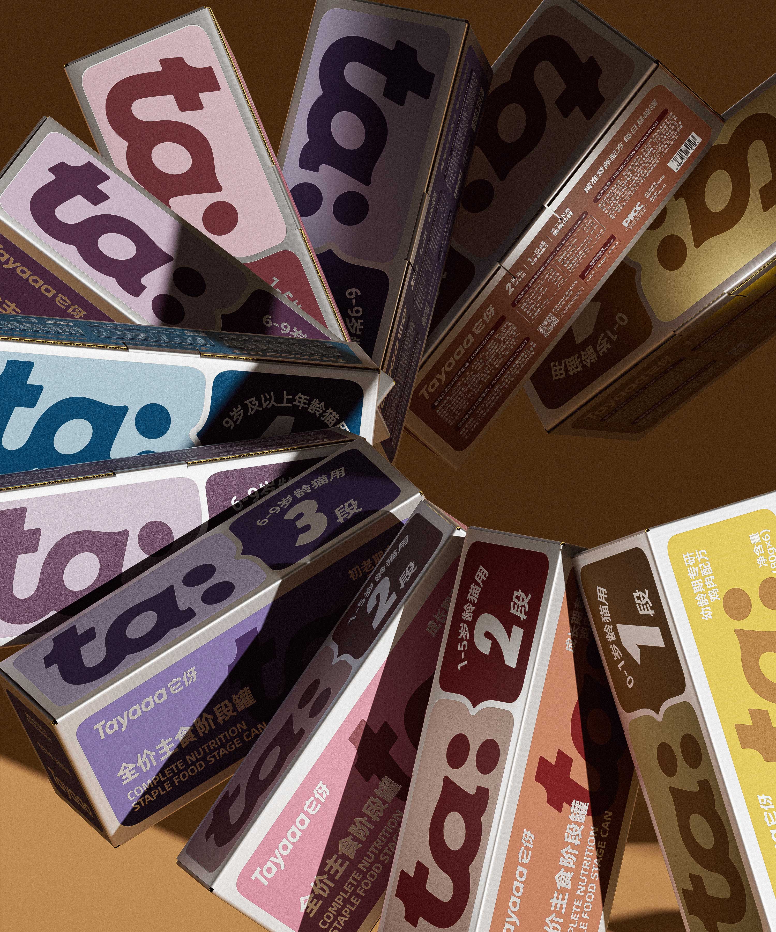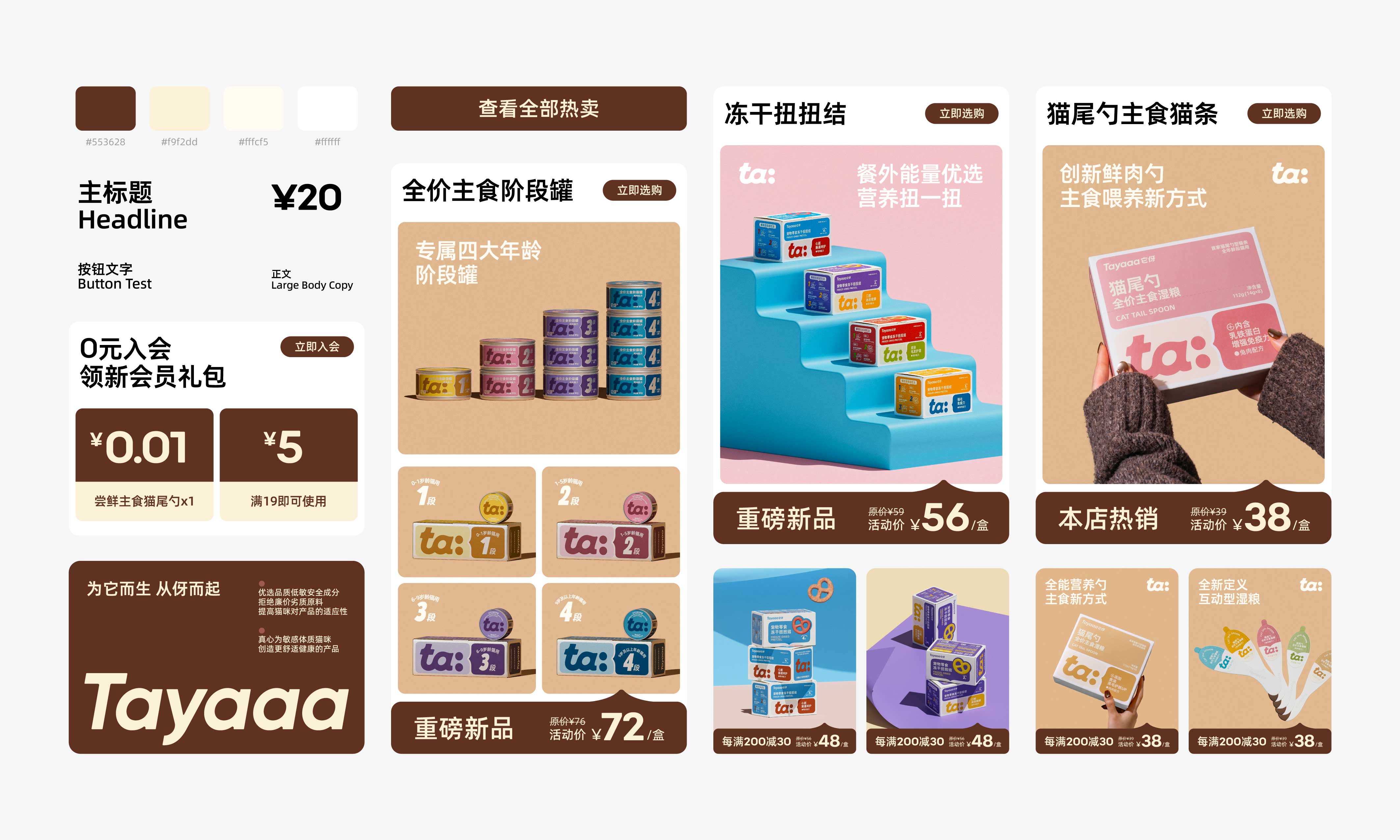 围绕产品体系,传递安心的视觉感受;色彩是视觉传达中最为快速的,颜色往往能产生行为暗示的作用。我们将它伢的色彩视觉定为:猫尾勺:温和、扭扭结:趣味、主食罐:科学。猫尾勺采用低饱和度色彩表达出温和低敏配方,扭扭结撞色设计搭配实物展示凸显趣味性和产品食欲感,主食罐使用银卡纸和露银工艺传递分阶喂养的专业感受。