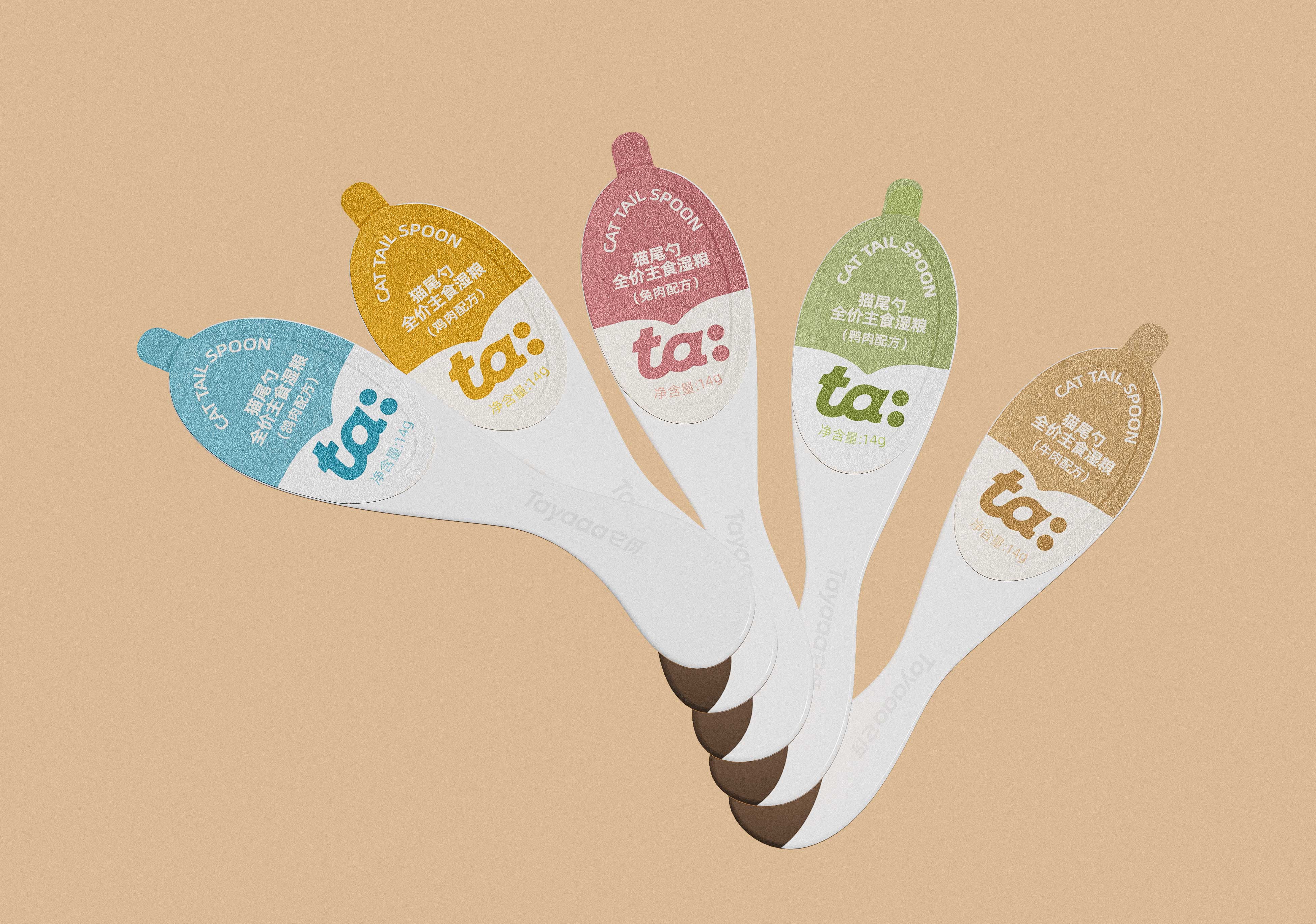 Surrounding the product system, conveying a reassuring visual experience; Color is the fastest form of visual communication, and it often has a suggestive effect on behavior. We define its color vision as: cat tail spoon: gentle, twisted: fun, staple food can: scientific. The cat tail spoon uses low saturation colors to express a mild and hypoallergenic formula, with a twisted and contrasting color design combined with physical display to highlight fun and product appetite. The main food can uses silver cardboard and exposed silver technology to convey a professional feeling of graded feeding.