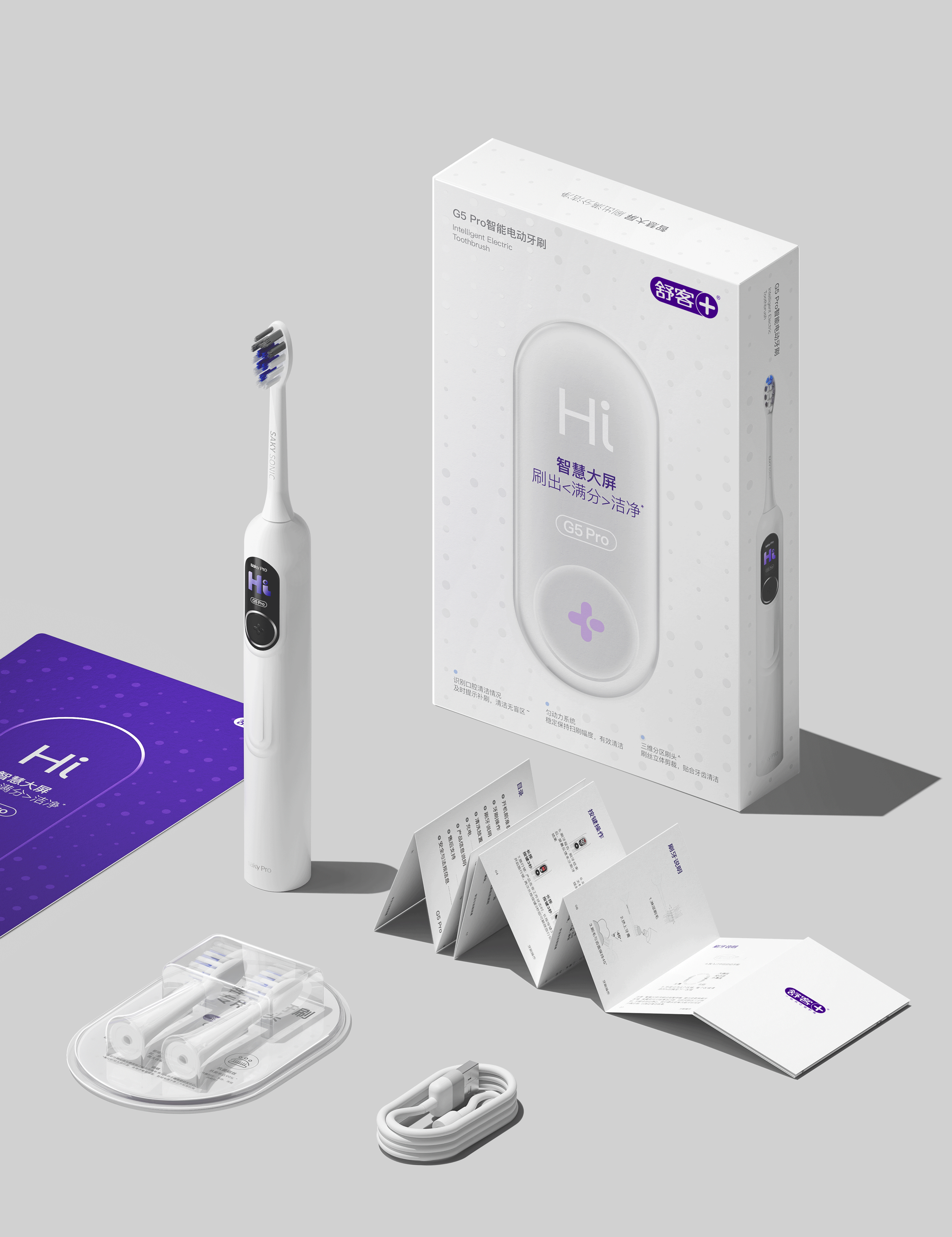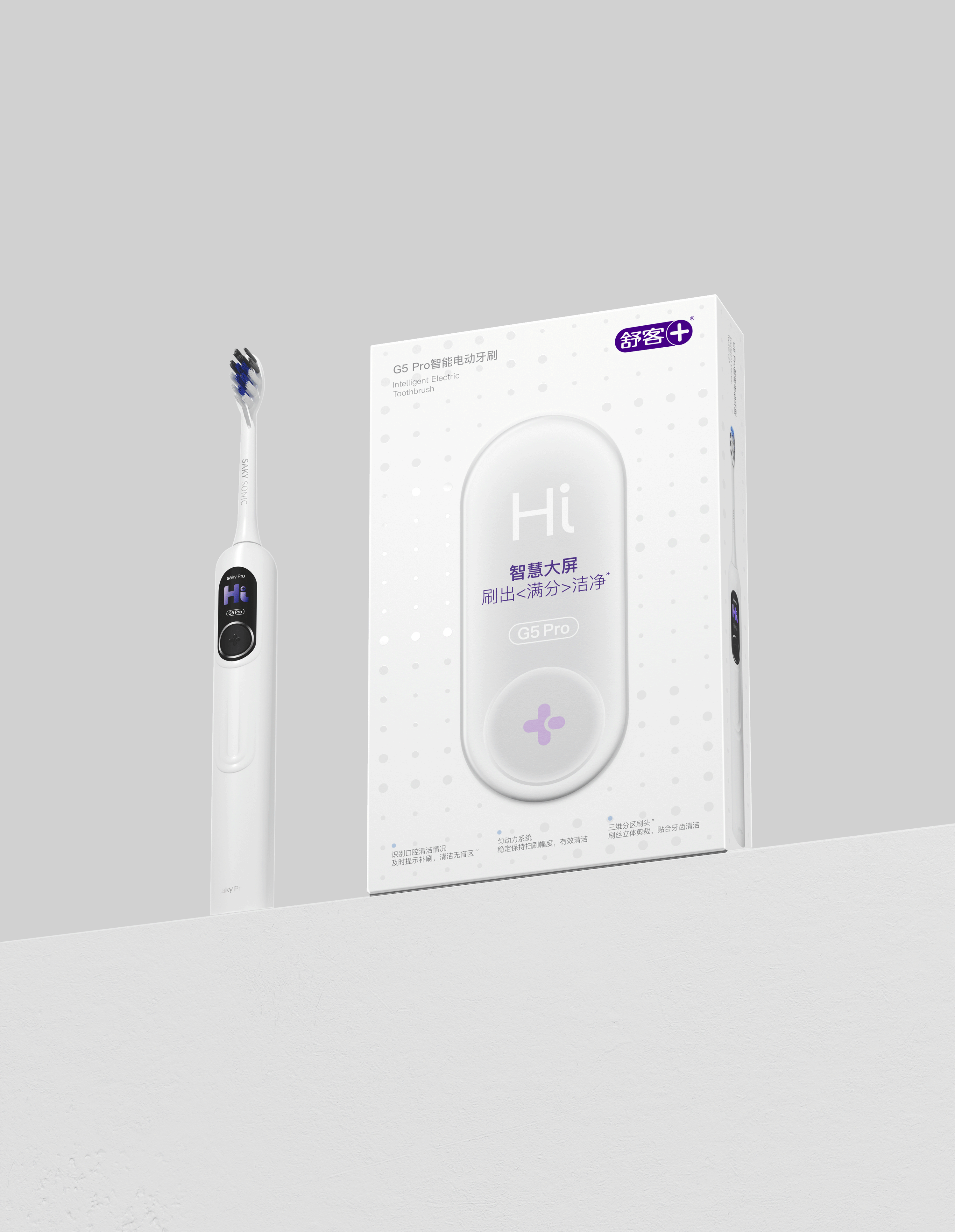 02:设计平衡点,匹配产品价值感。围绕舒客G5 Pro产品策略定位,基于客户提供竞争对手及用户画像的数据分析,得出本次设计的平衡点:40%科技感 30%简约感 30%专业感。